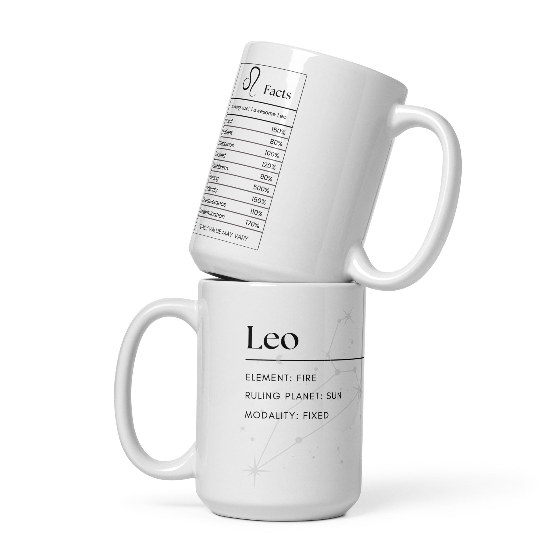 Looking for a fun addition to your caffeinated mornings? Enjoy your morning brew with this Leo nutrition facts inspired mug with the constellation and elements. This ceramic mug is sure to put a smile on your face! It’s dishwasher-safe and perfect for everyday use.